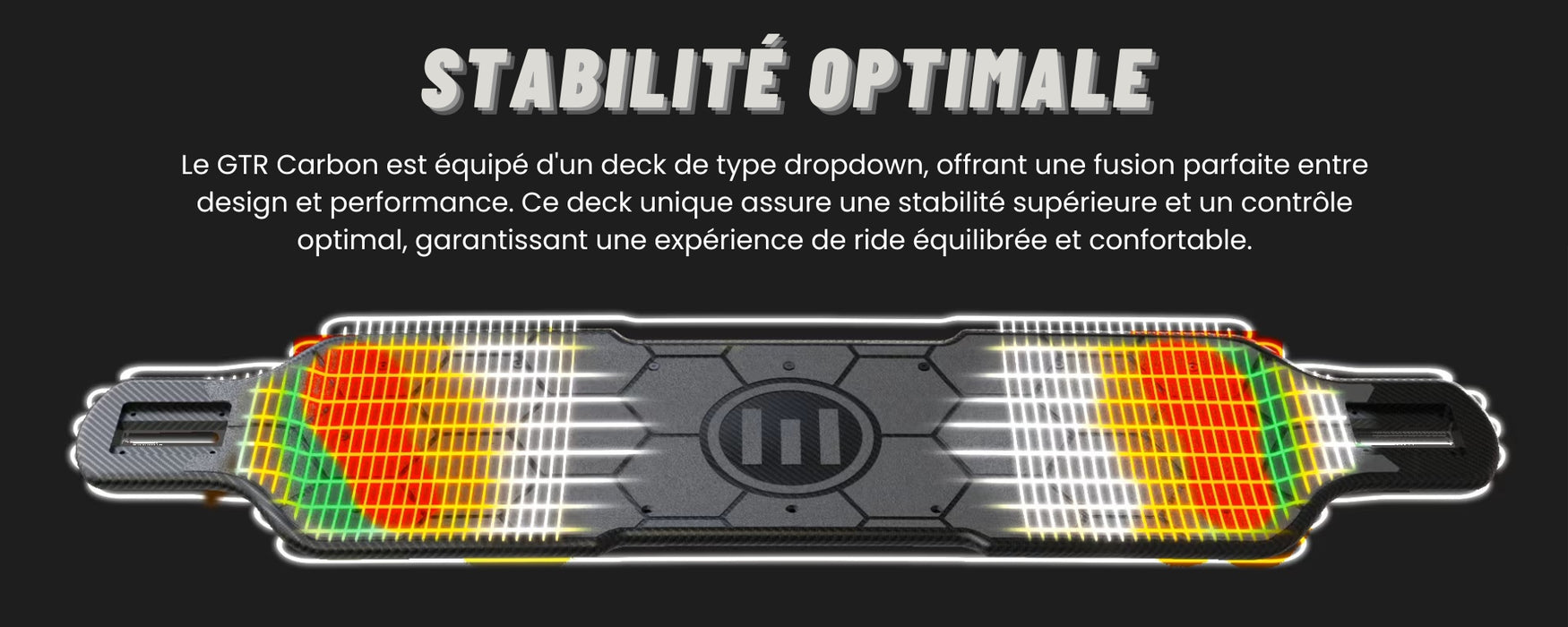 Avec le deck en fibre de carbone du GTR2 Carbon, chaque ride est une expérience maßtrisée. Sa rigidité unique vous offre un contrÎle ultra-précis, idéal pour les virages serrés et agressifs, tout en maintenant une excellente stabilité pour les courbes appuyées.