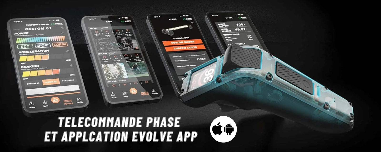 Prenez les commandes avec la tĂ©lĂ©commande Phaze, conçue pour un contrĂŽle ultra-rĂ©actif. GrĂące Ă  ses doubles gĂąchettes, vous gĂ©rez l’accĂ©lĂ©ration et le freinage avec prĂ©cision. Choisissez parmi trois modes de ride prĂ©dĂ©finis — ECO, SPORT, GTR — ou personnalisez tout via l’application Explore By Evolve pour une expĂ©rience sur mesure.